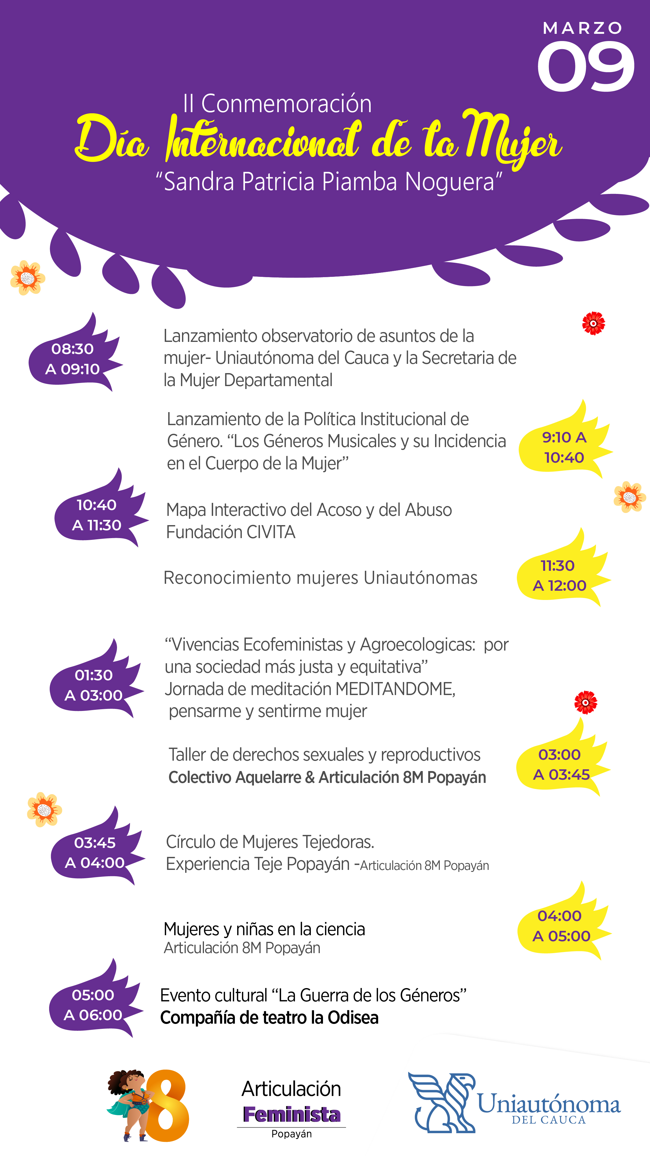 Este 9 de marzo en el auditorio La Quimera de la Uniautónoma del Cauca se realiza la II CONMEMORACIÓN DEL DIA INTERNACIONAL DE LA MUJER “SANDRA PATRICIA PIAMBA NOGUERA”.  El Día Internacional de la Mujer Trabajadora, también llamado Día Internacional de la Mujer, conmemora la lucha de la mujer por su participación, en pie de igualdad con el hombre, en la sociedad y en su desarrollo integro como persona.