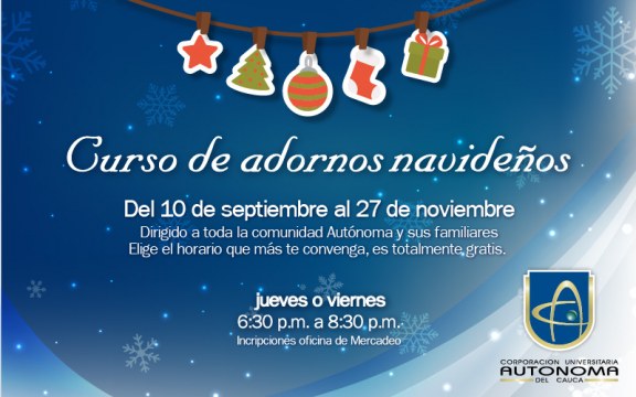 Te invitamos a que participes de los cursos para elaborar adornos navideños, dirigido a toda la comunidad Uniautónoma y sus familiares. La actividad, que inicia el 10 de septiembre y termina el 27 de noviembre, se dictará en dos jornadas diferentes: una los jueves y otra los viernes, de 6:30 p.m. a 8:30 a.m.