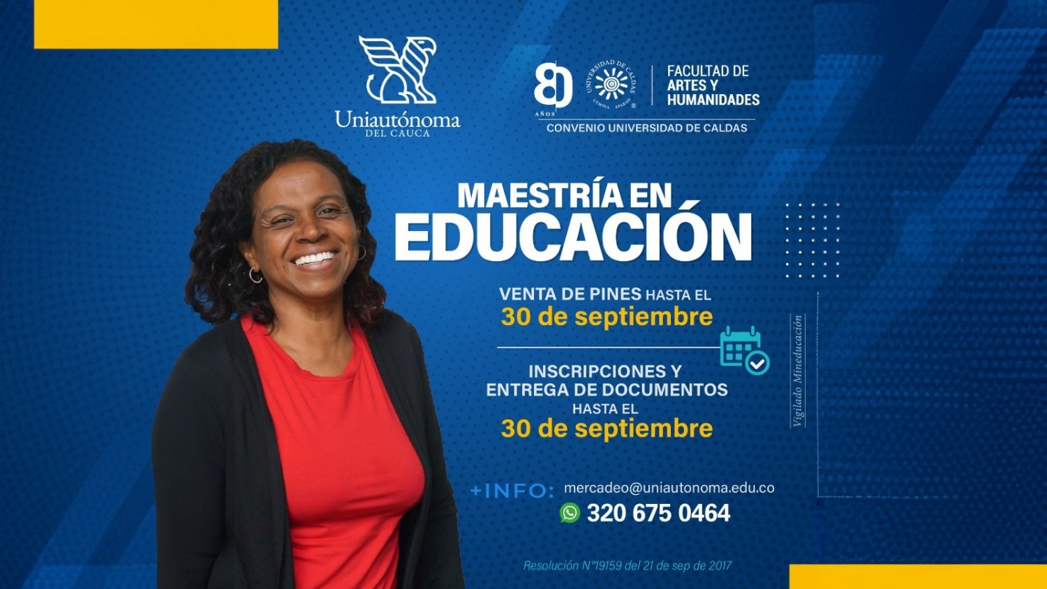 La Uniautónoma del Cauca y la Universidad de Caldas le ofrecen la oportunidad de hacer parte de nuestra comunidad académica matriculándose en la Maestría en Educación con Registro Calificado y Acreditación de Alta Calidad, que le garantiza una formación ideal para sus proyectos de vida y profesional en el campo de la educación.