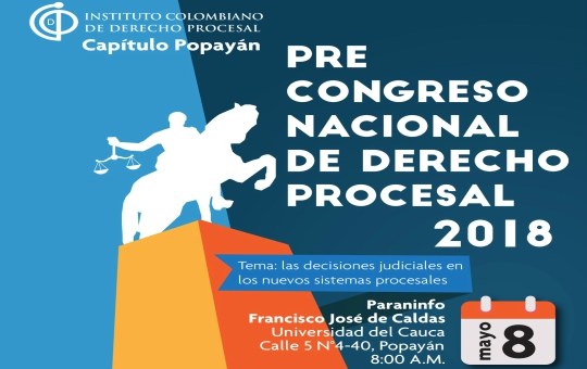 La Facultad de Derecho y el Consultorio Jurídico de la Corporación Universitaria Autónoma del Cauca invitan a la comunidad académica a participar del pre Congreso de Derecho Procesal Capítulo Popayán, que este año se realizará el martes 8 de mayo en el paraninfo Francisco José de Caldas de la Universidad del Cauca y abordará la temática ‘Decisiones Judiciales en los sistemas Procesales’